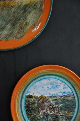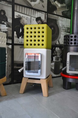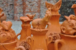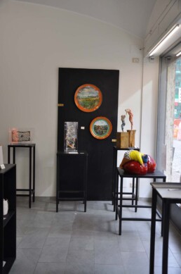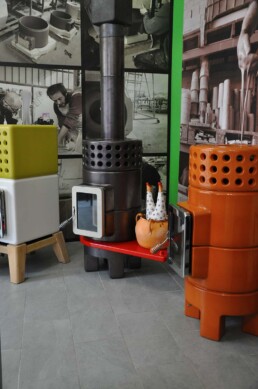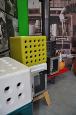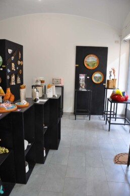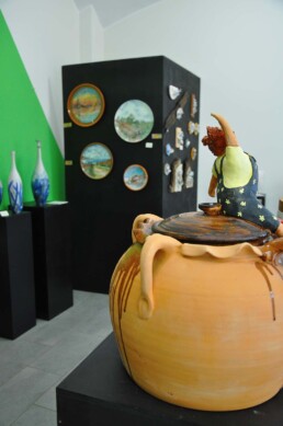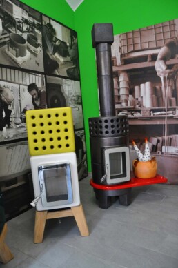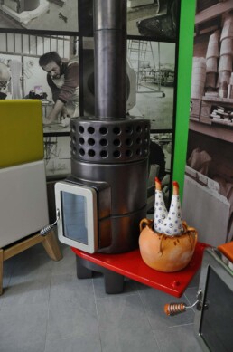 A small yet rich space, showcasing our ceramic stoves and artworks by many artists—plates, sculptures, and decorative ceramic pieces, all 100% handmade.