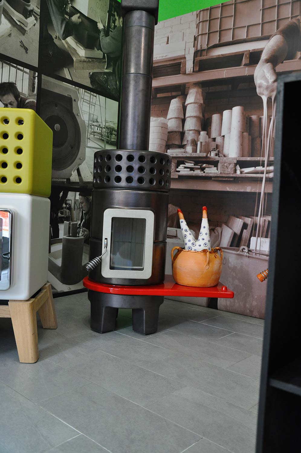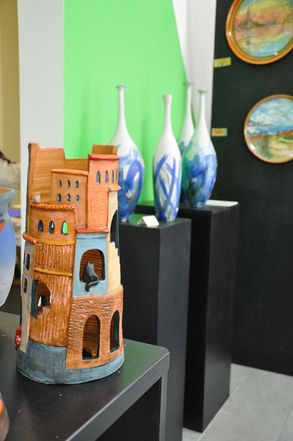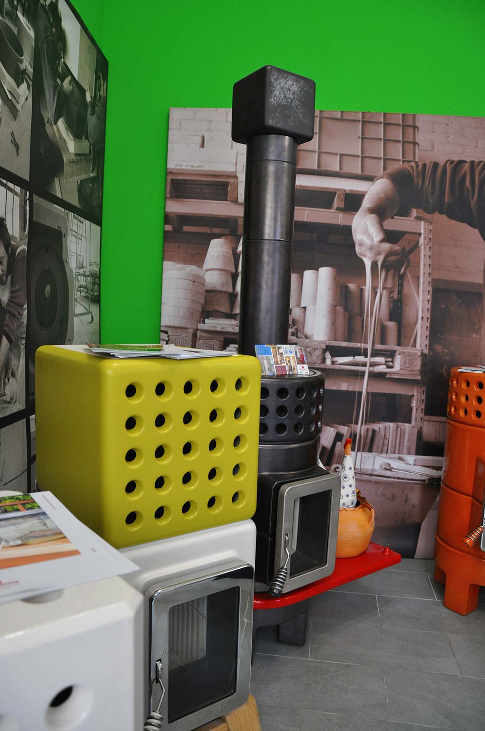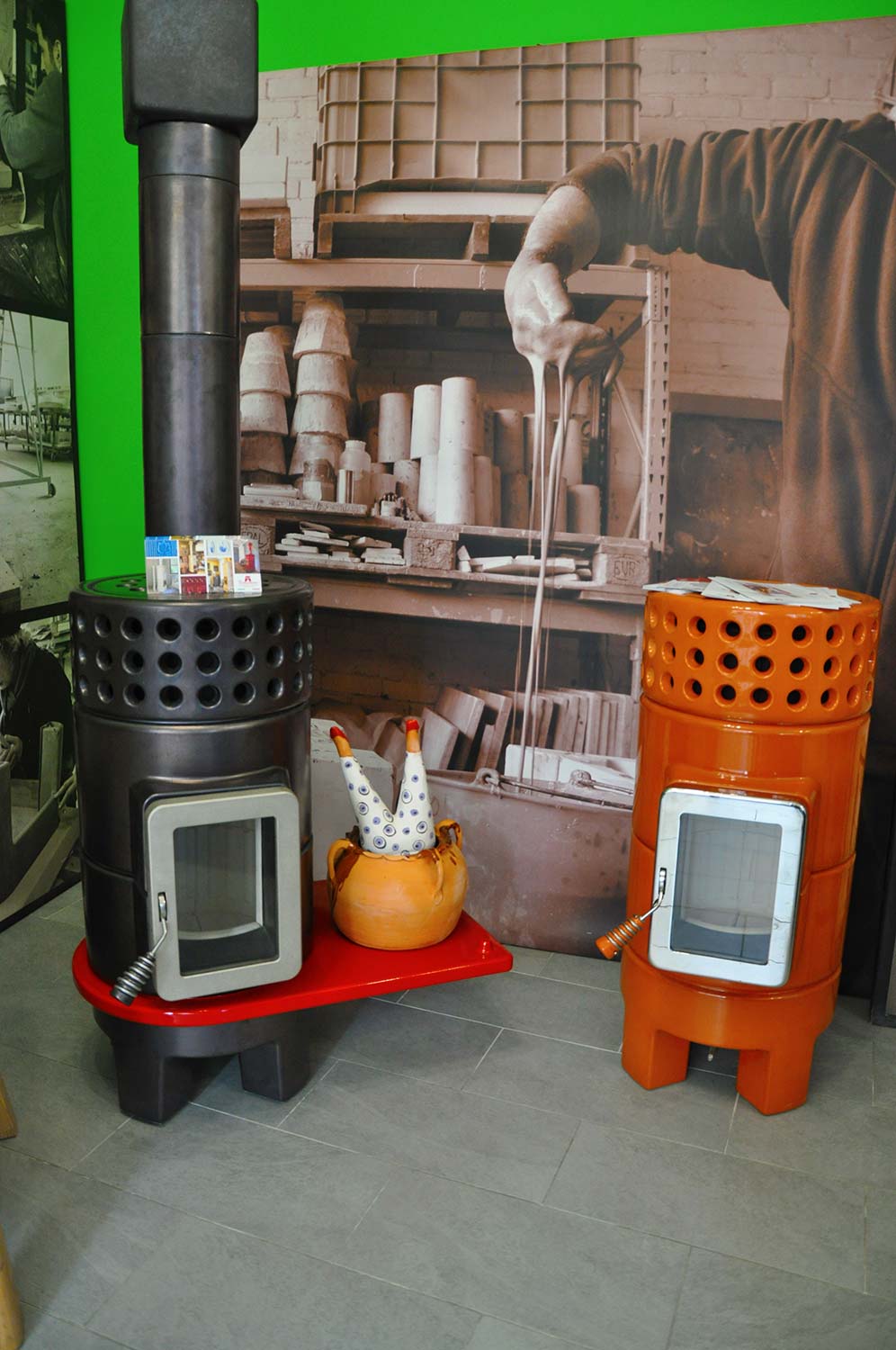 A small yet rich space, showcasing our ceramic stoves and artworks by many artists—plates, sculptures, and decorative ceramic pieces, all 100% handmade.