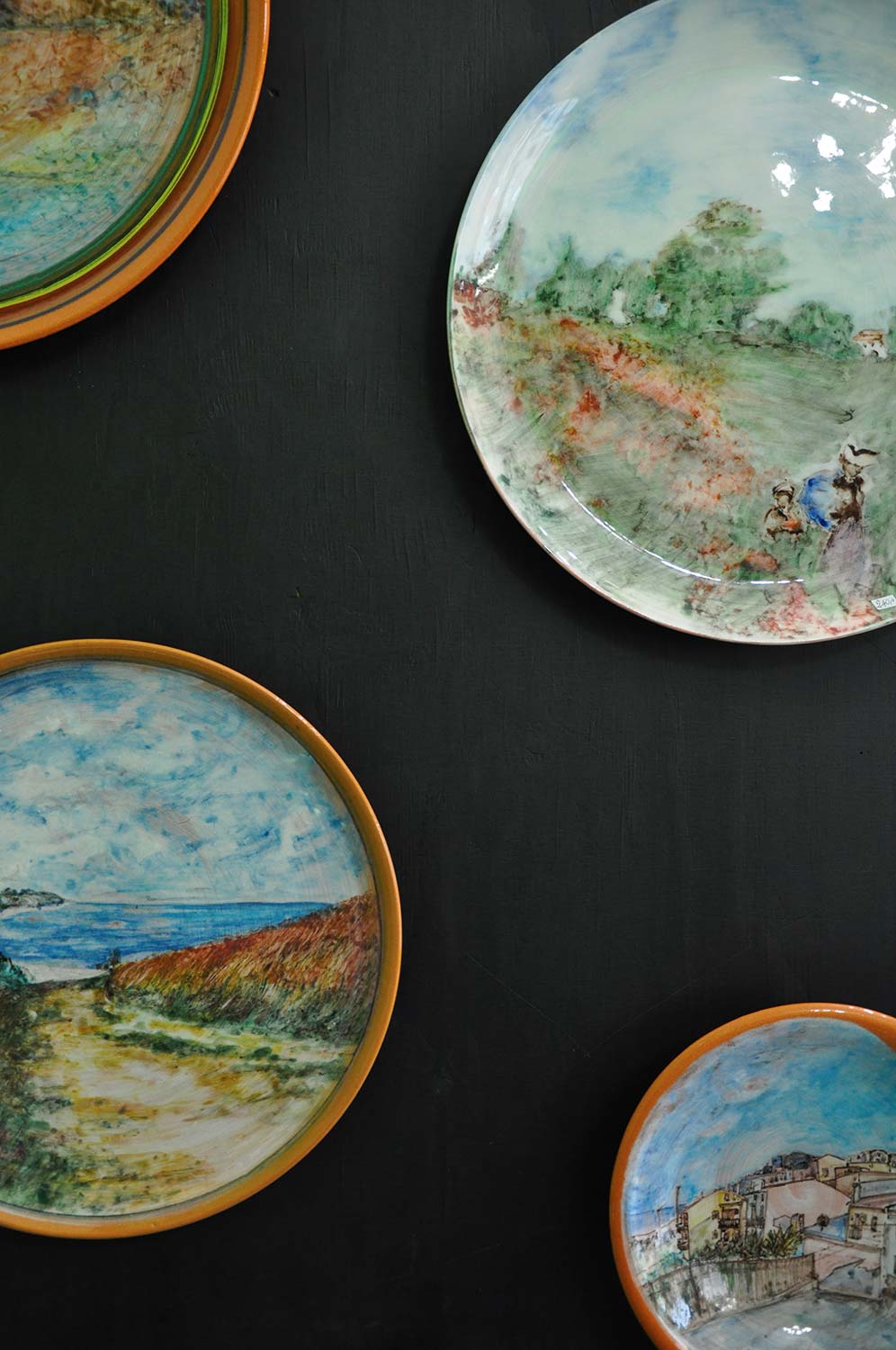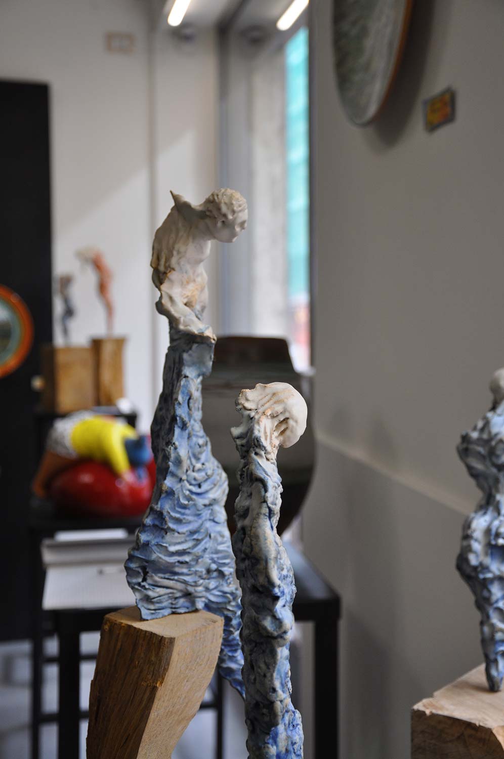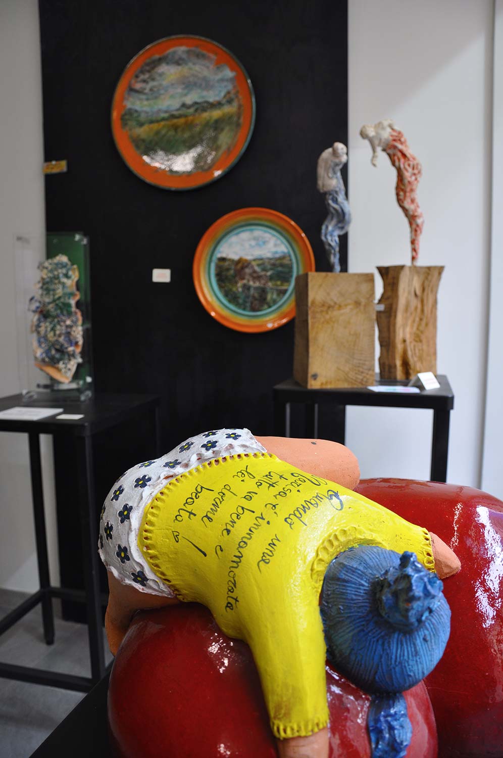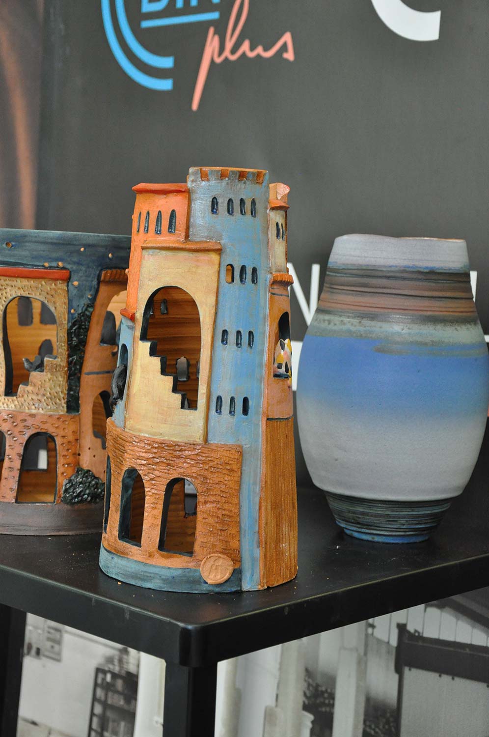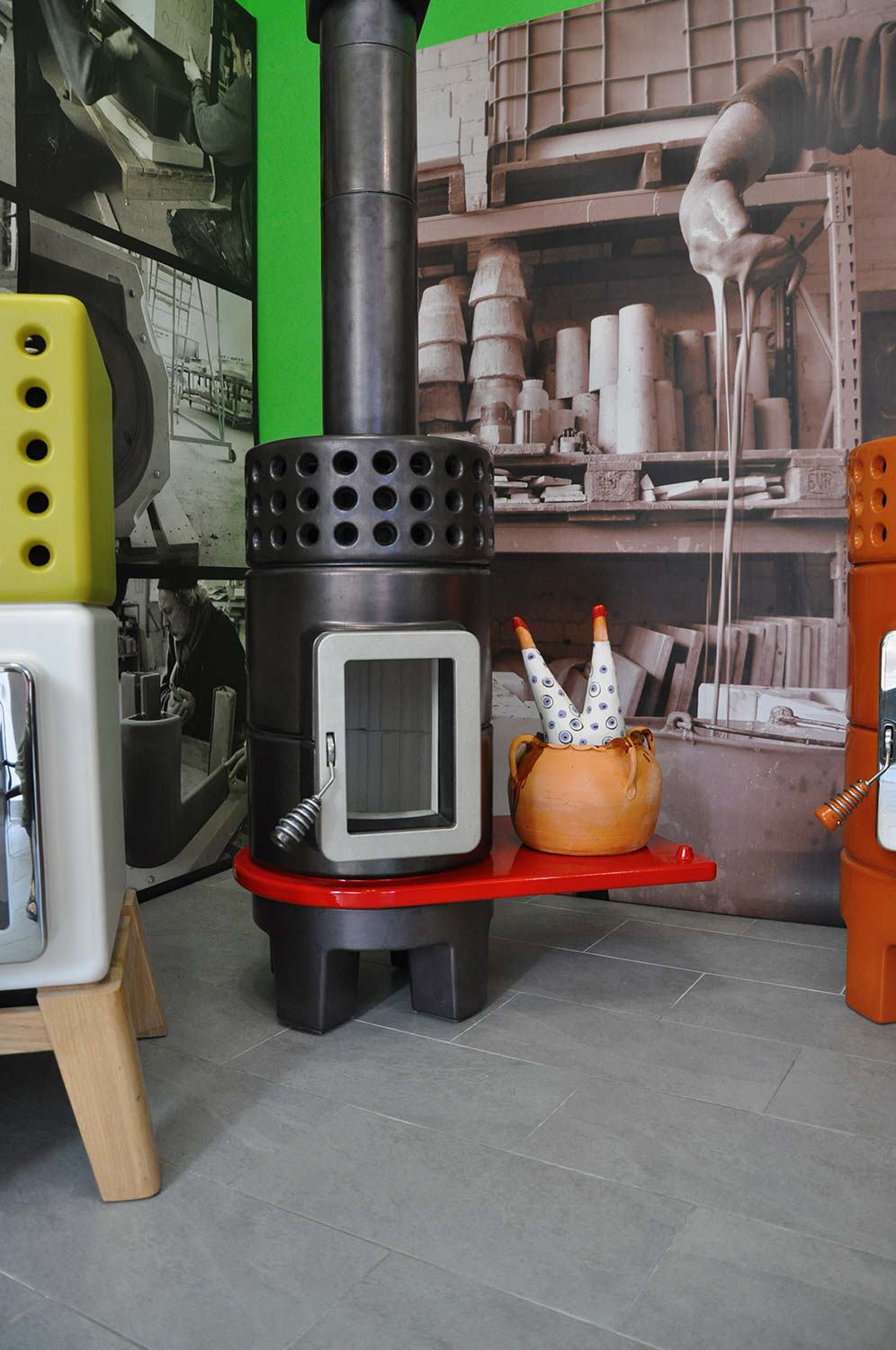 A small yet rich space, showcasing our ceramic stoves and artworks by many artists—plates, sculptures, and decorative ceramic pieces, all 100% handmade.