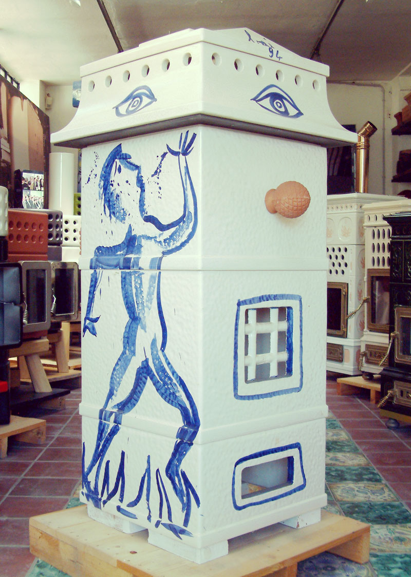 On the Stove mod. Vulcano, duly replicated in an unusual sequence, Enrico Baj has left, with the help of fire, the indelible mark of his painting.